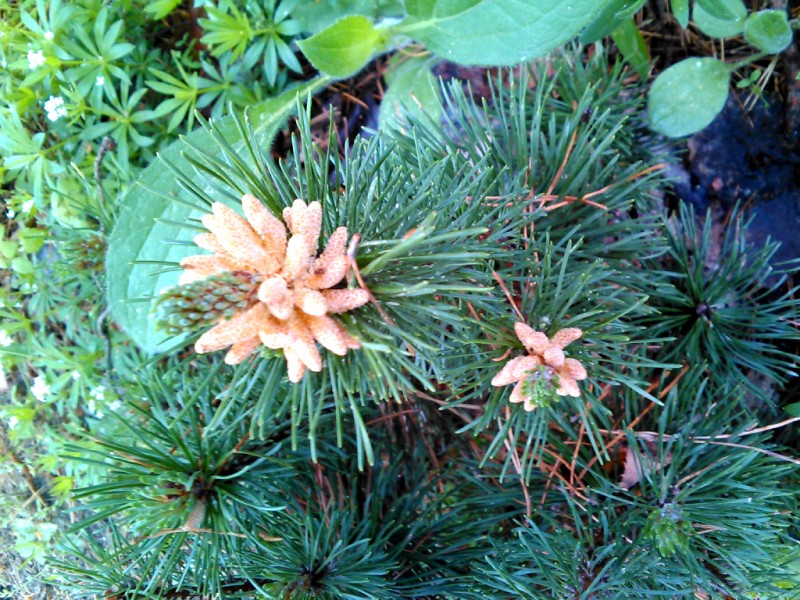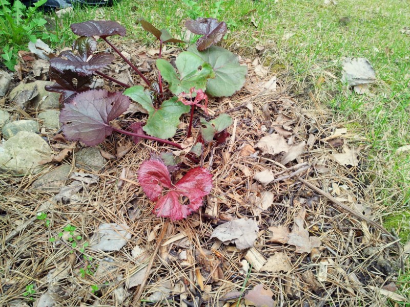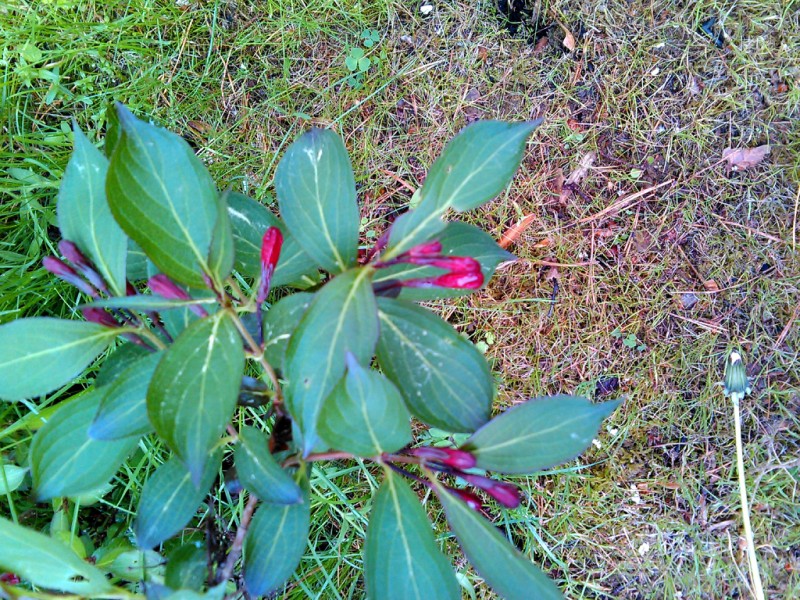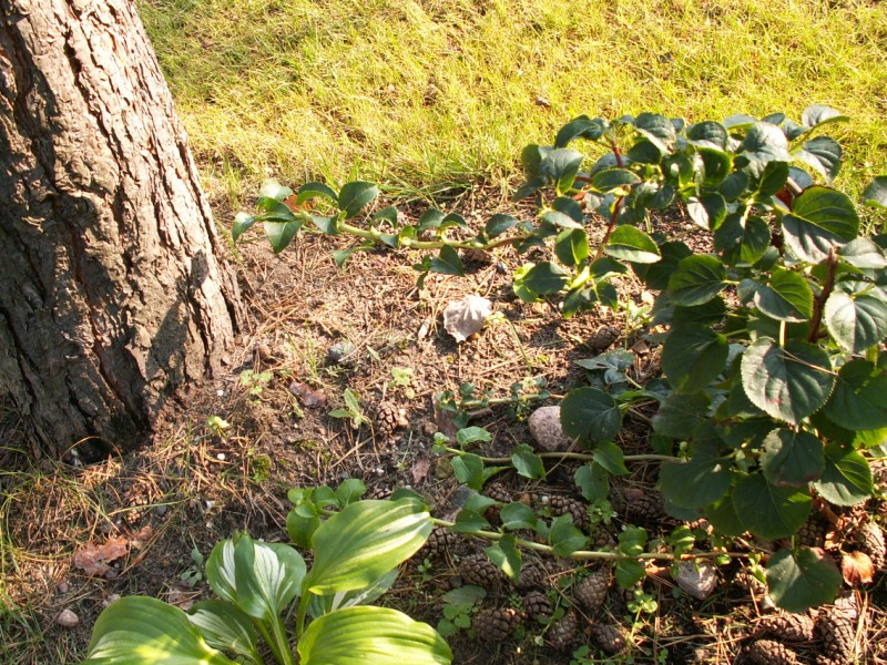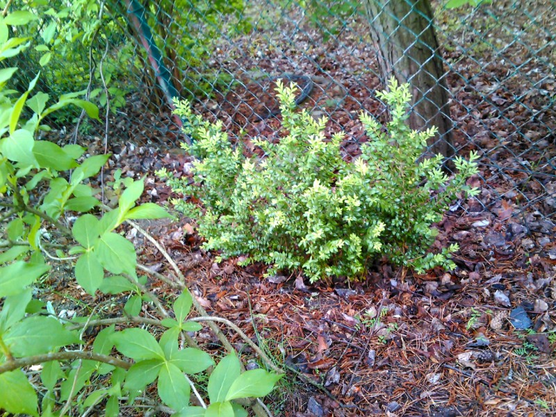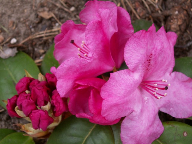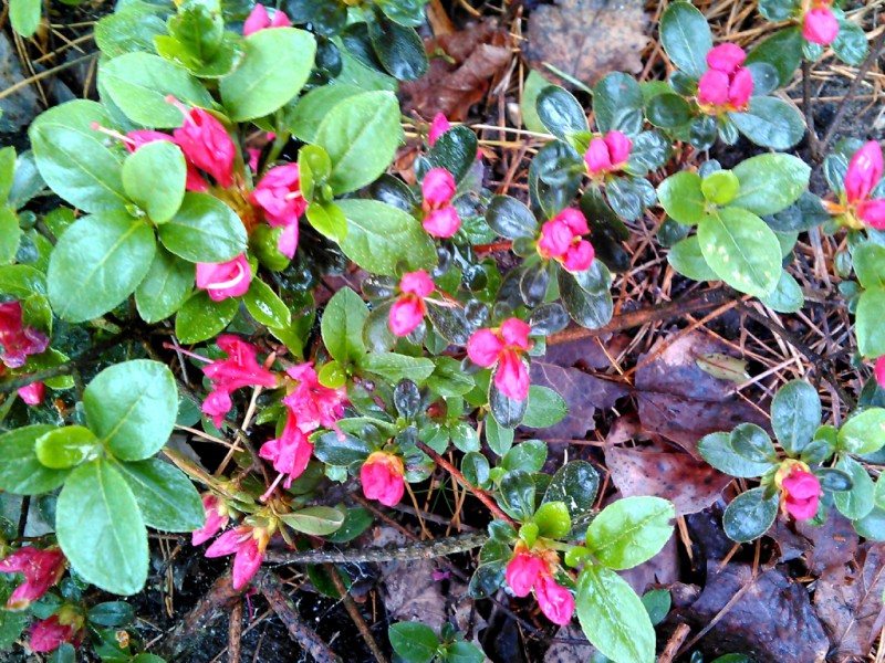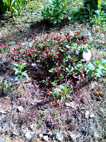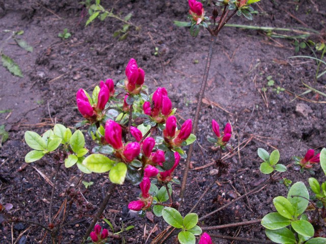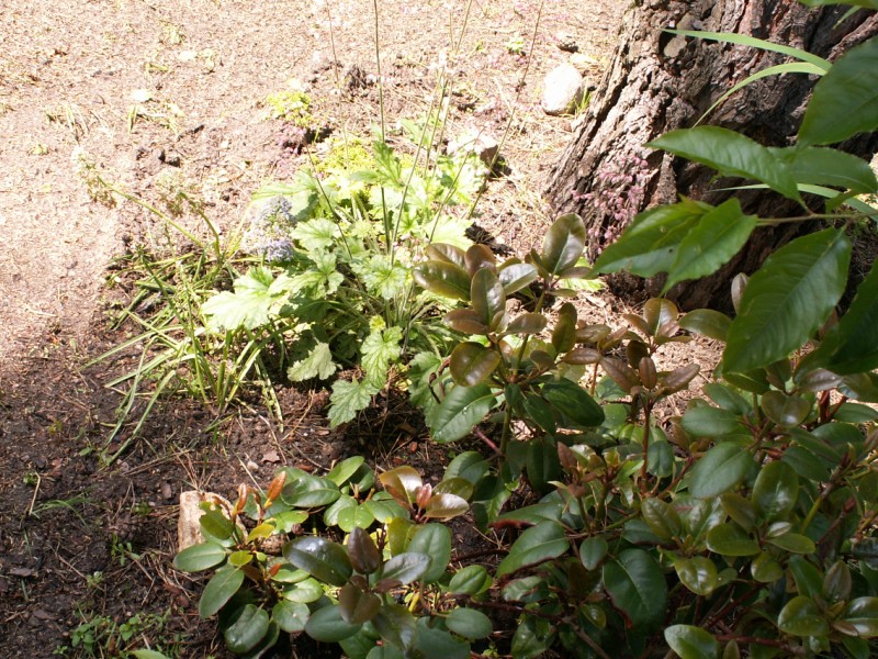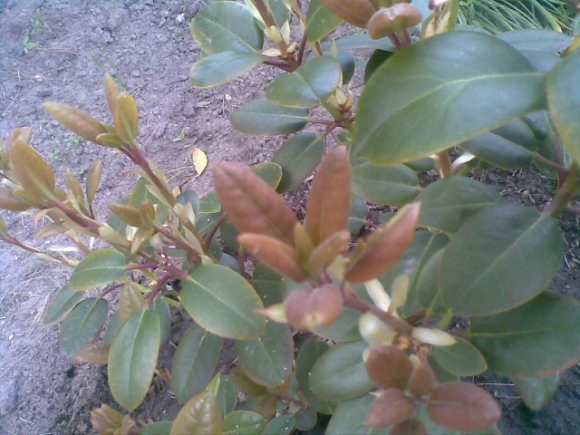 …i od razu popełniłam błąd przy sadzeniu: pożałowałam kwaśnego torfu i ściółki z kory, przekonana, że igły i szyszki dostatecznie zakwasiły glebę i mam idealne warunki dla kwaśnolubnych. Niestety, brzegi liści zaczęły brązowieć i roślina nie wyglądała zdrowo, mimo, ze zdążyła pięknie zakwitnąć. Brak ściółki spowodował wysychanie, co zauważyliśmy po tygodniu nieobecności w Osolinie. Oczywiście błędy naprawiłam, wymieniając glebę wokół kwiatka i ściółkując zebranymi w ogrodzie szyszkami. Zauważyłam również, że rozwijające się młode listki tego różanecznika są jasno-brązowe i lepkie. To mnie oczywiście przestraszyło nie na żarty, ale eksperci na Forum Ogrodniczym uspokoili mnie, że to naturalne dla niektórych odmian