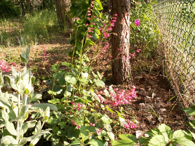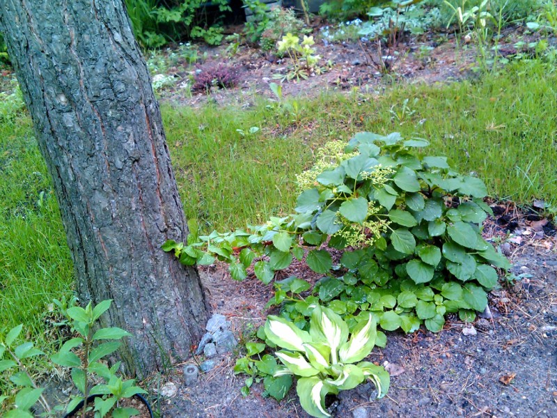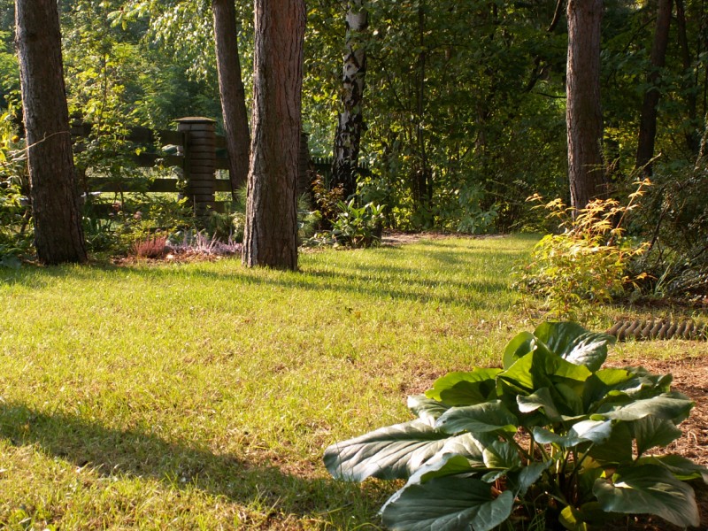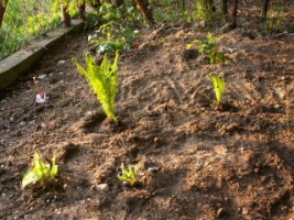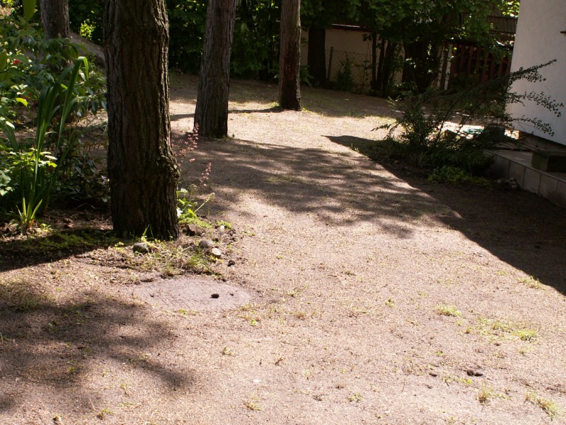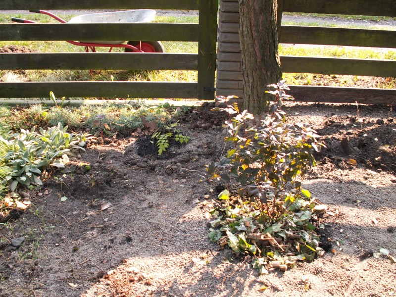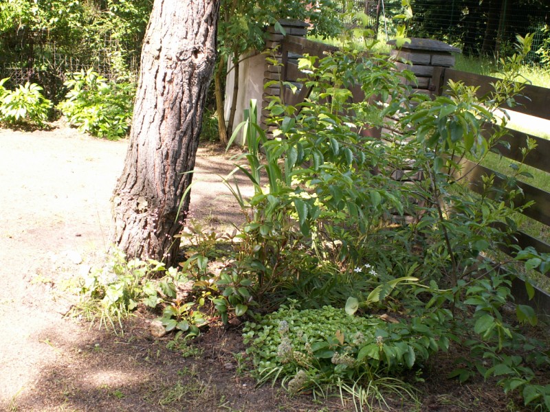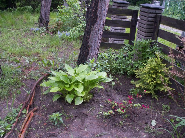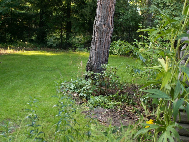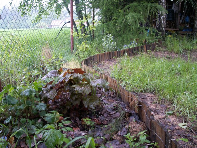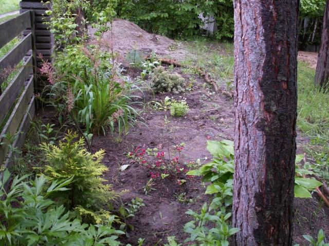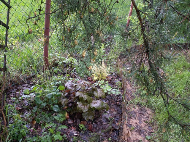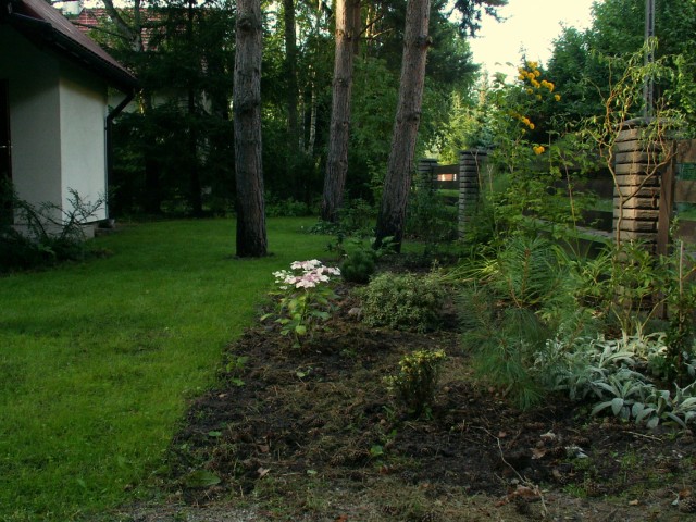 Posadziłam jeszcze tuż przy siatce dwa krzaczki mahonii ostrolistnej, która również dobrze rośnie w cieniu. Okazało się jednak, że mój cienisty zakątek tylko wczesną wiosną, za sprawą topniejących śniegów, ma tak cudownie wilgotne podłoże. Wraz z czasem i rosnącą temperaturą ogród pokazał całą prawdę o sobie: ziemia tu sucha, piaszczysta, w sam raz dla sosen, perzu i podagrycznika!. Całe pięć dni nieobecności w ogrodzie przy bezdeszczowej pogodzie sieje straszne spustoszenia! Konieczne będzie nawiezienie dobrej ziemi i nawadnianie, nawadnianie… Ale przedtem należało wyrównać teren, a do tego podchodziliśmy z dużymi obawami. Bez kopareczki, tylko szpadel i taczka…