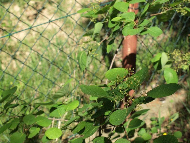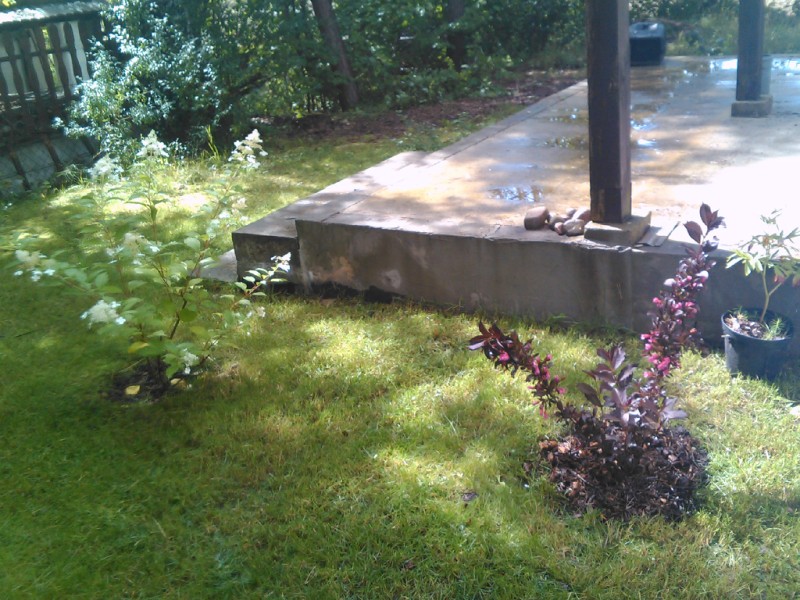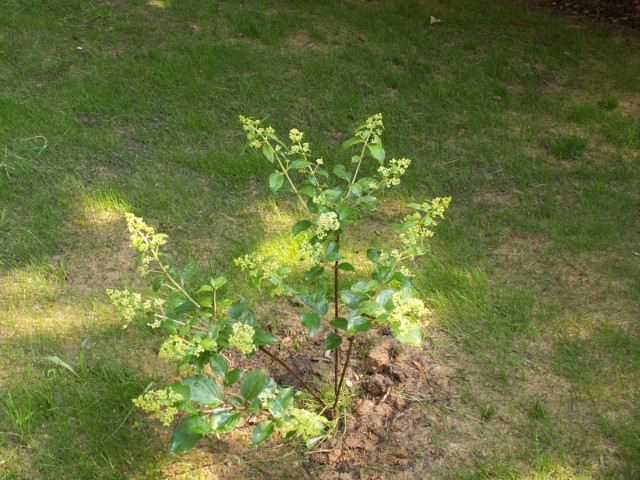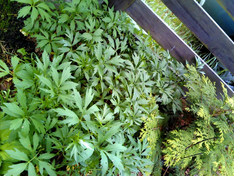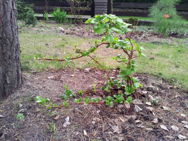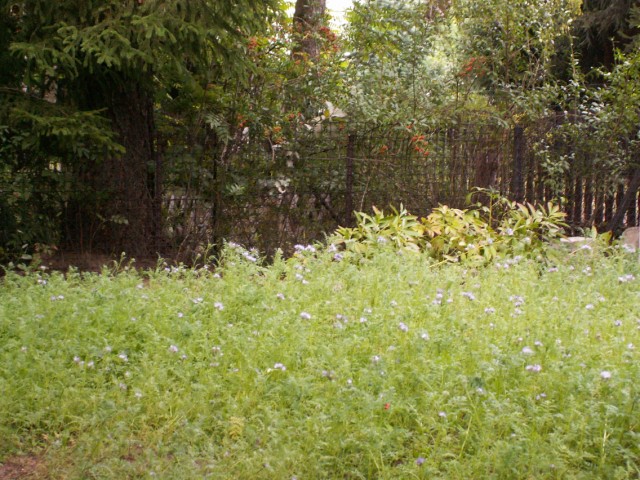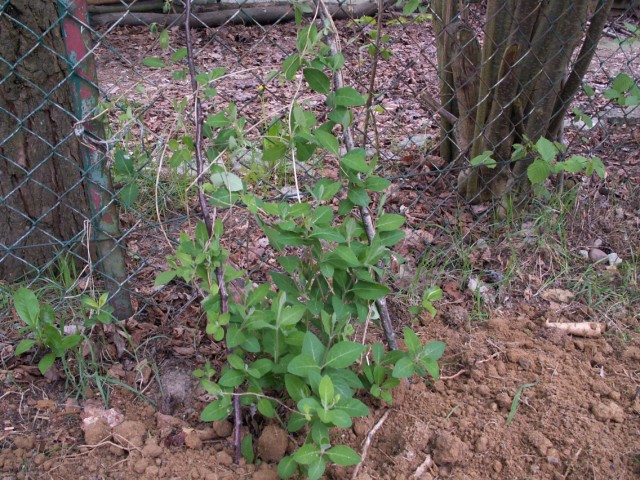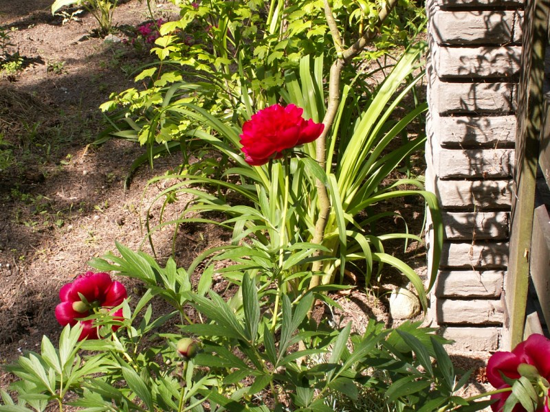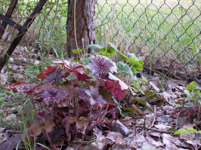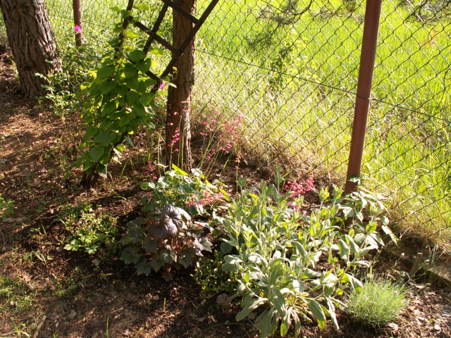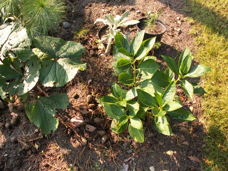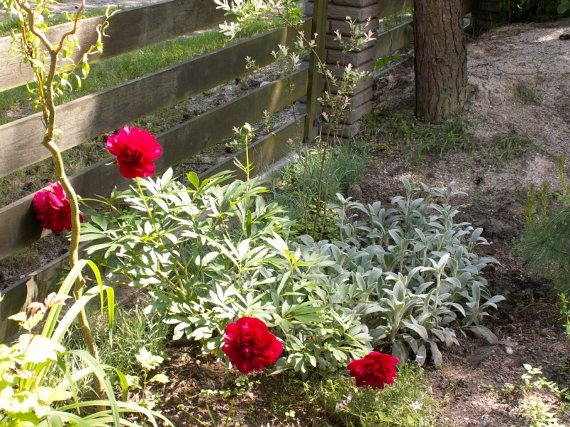 Posadziłam jeszcze tuż przy siatce dwa krzaczki mahonii ostrolistnej, która również dobrze rośnie w cieniu. Okazało się jednak, że mój cienisty zakątek tylko wczesną wiosną, za sprawą topniejących śniegów, ma tak cudownie wilgotne podłoże. Wraz z czasem i rosnącą temperaturą ogród pokazał całą prawdę o sobie: ziemia tu sucha, piaszczysta, w sam raz dla sosen, perzu i podagrycznika!. Całe pięć dni nieobecności w ogrodzie przy bezdeszczowej pogodzie sieje straszne spustoszenia! Konieczne będzie nawiezienie dobrej ziemi i nawadnianie, nawadnianie… Ale przedtem należało wyrównać teren, a do tego podchodziliśmy z dużymi obawami. Bez kopareczki, tylko szpadel i taczka…
