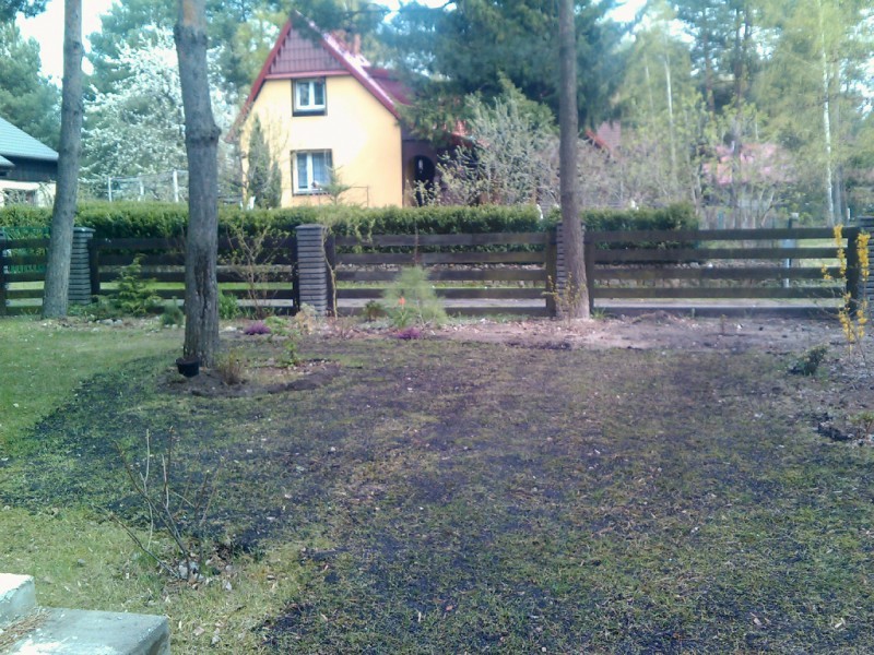 Widły, pazurki i dużo płynów do picia. Wbijałam widły dość płytko, pod kątem, tak aby podważyć kępę, potem na kolanach dokładnie otrzepywałam ją z ziemi. I tak kępa po kępie rosła góra kompostowa. W marcu ziemia była jeszcze mięciutka i wilgotna więc kopało się nawet miło… Pierwszy oczyszczony fragment został od razu wstępnie wyrównany i ubity pod wysiew trawy. Postanowiłam również wytyczyć PIERWSZE RABATY, w których miały się pojawić pięknie kwitnące różaneczniki i azalie