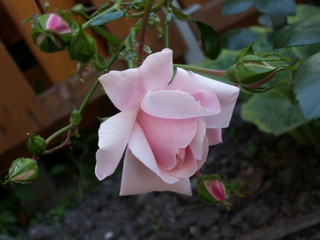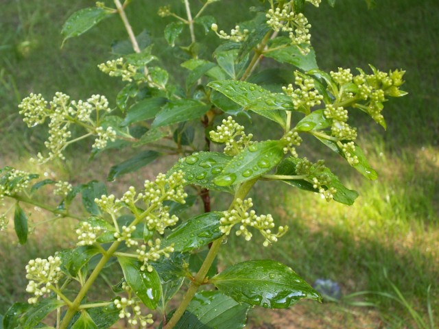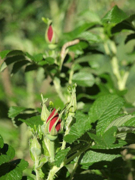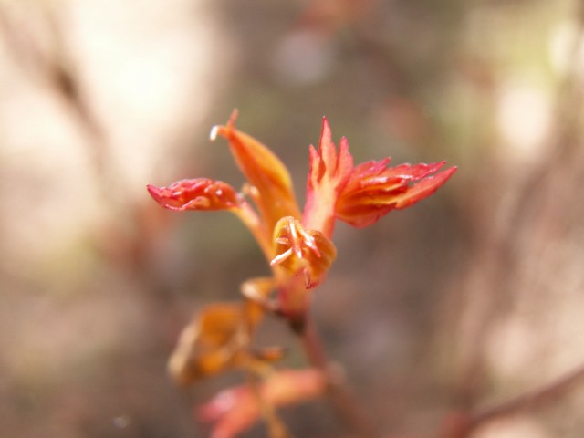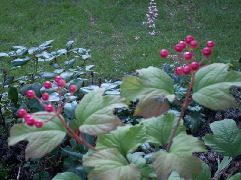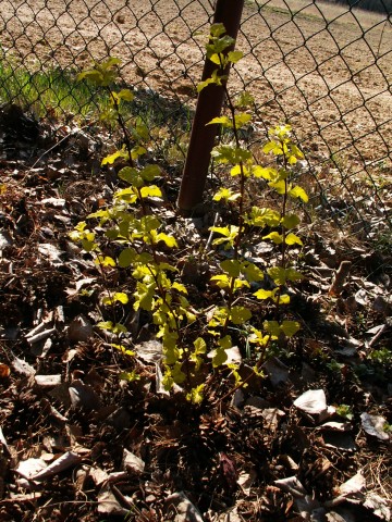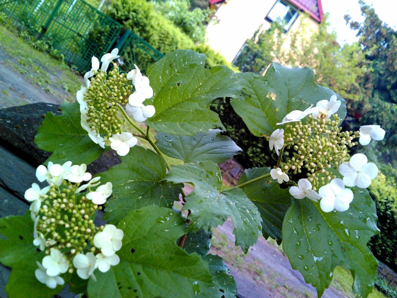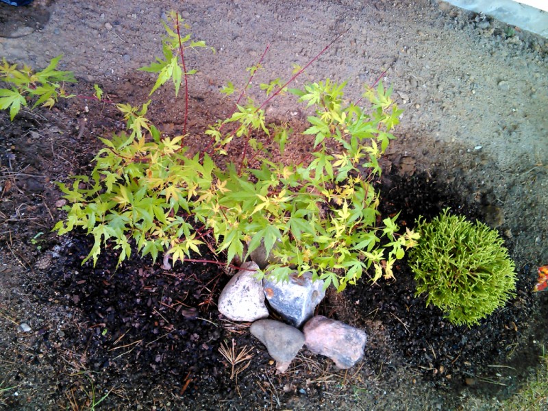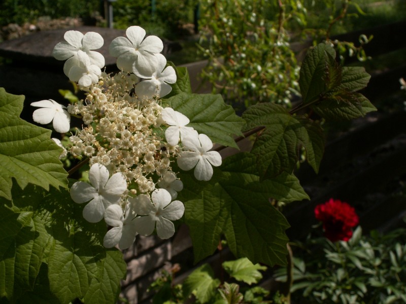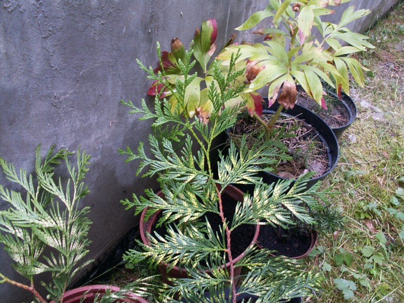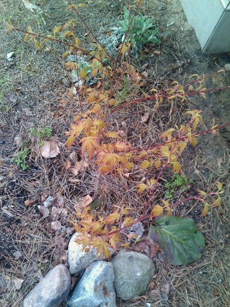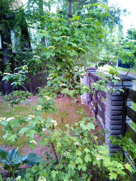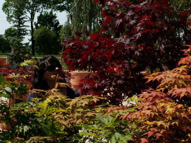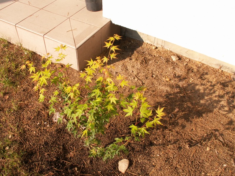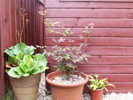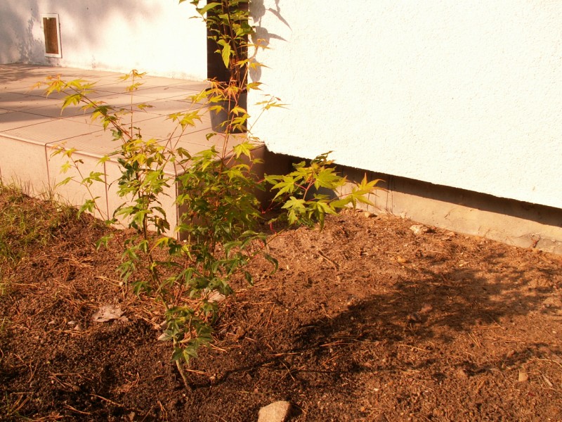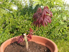 Jest to klon palmowy Acer palmatum atropurpureum, który przysporzył mi sporo problemów. Powinnam raczej powiedzieć, że to ja mu przysparzałam kłopotów sadząc w nieodpowiedniej, gliniastej ziemi, wystawiając na ostre słońce i wiatr i nie zapewniając mu odpowiedniej wilgoci w powietrzu, przez co o mało go nie straciłam! W porę wykopałam go z ziemi z ociekającymi wodą korzeniami, przycięłam prawie przy ziemi martwe gałązki i umieściłam w donicy z drenażem na dnie. Ziemia lekko kwaśna, ściółka i częste zraszanie. Na drugim zdjęciu widać, że mu się te zabiegi spodobały:). Kiedy już „wydobrzeje” znajdę mu odpowiednie miejsce w ogrodzie.