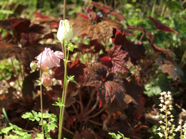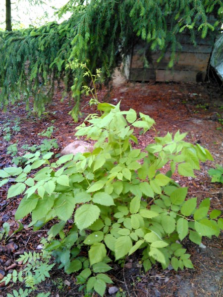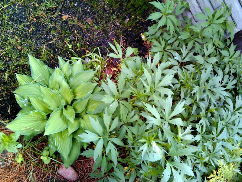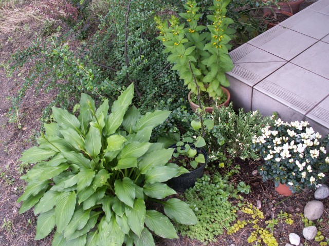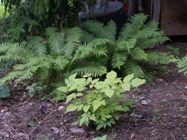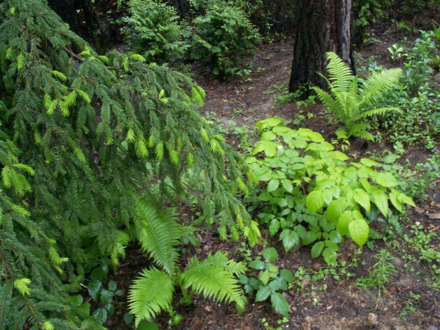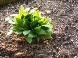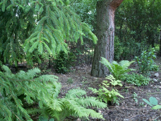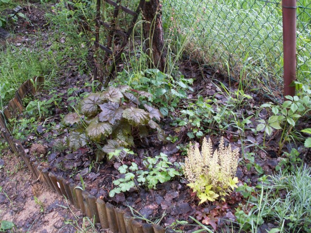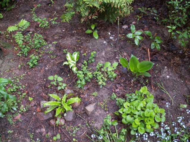 Pierwsza rabatka w tej części ogródka dała mi dużo radości i nadziei, że jednak możliwe będzie stworzenie tu przyjaznej przestrzeni, jednak po kilku miesiącach obserwacji i pielęgnacji wiem, że na wersję ostateczną zagospodarowana tego miejsca trzeba będzie jeszcze poczekać. Grabiąc liście po zimie odkryłam w kącie ogrodu urokliwy cienisty kącik pod młodym świerkiem, za drewnianą budką, służącą obecnie za domek narzędziowy. Pod liściową pierzynką powstała warstwa żyznej, wilgotnej ziemi, w której od razu wyobraziłam sobie piękne kępy funkii, paproci i konwalii. Jak pomyślałam, tak zrobiłam, posadziłam roślinki, podlałam i …. czekałam na efekty.