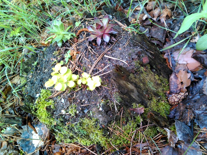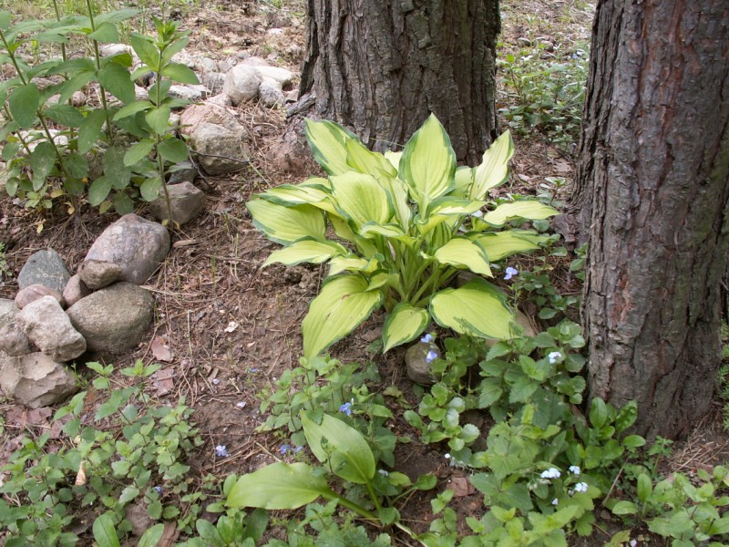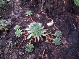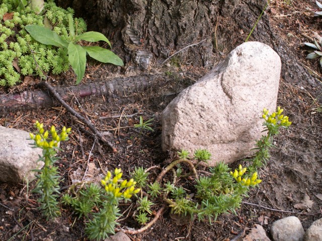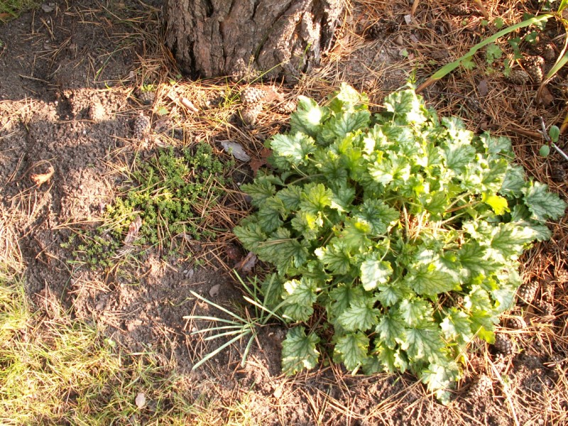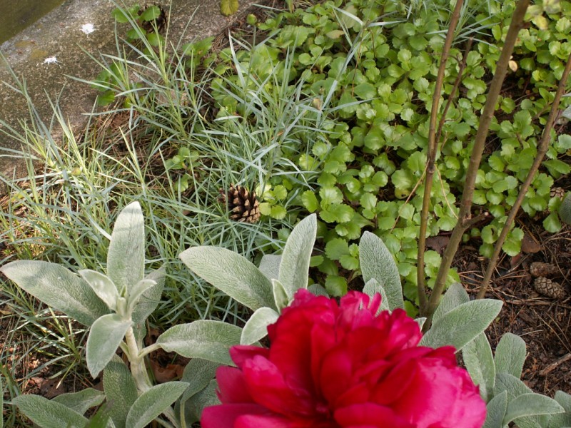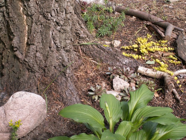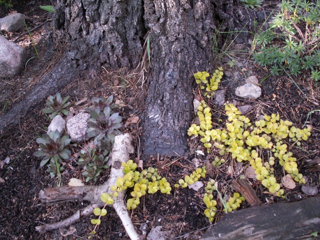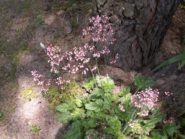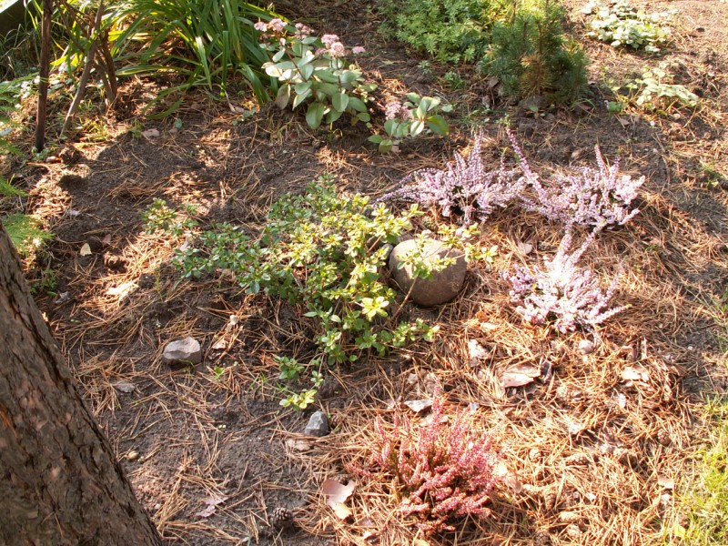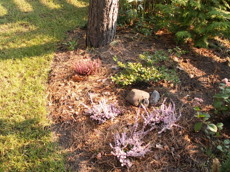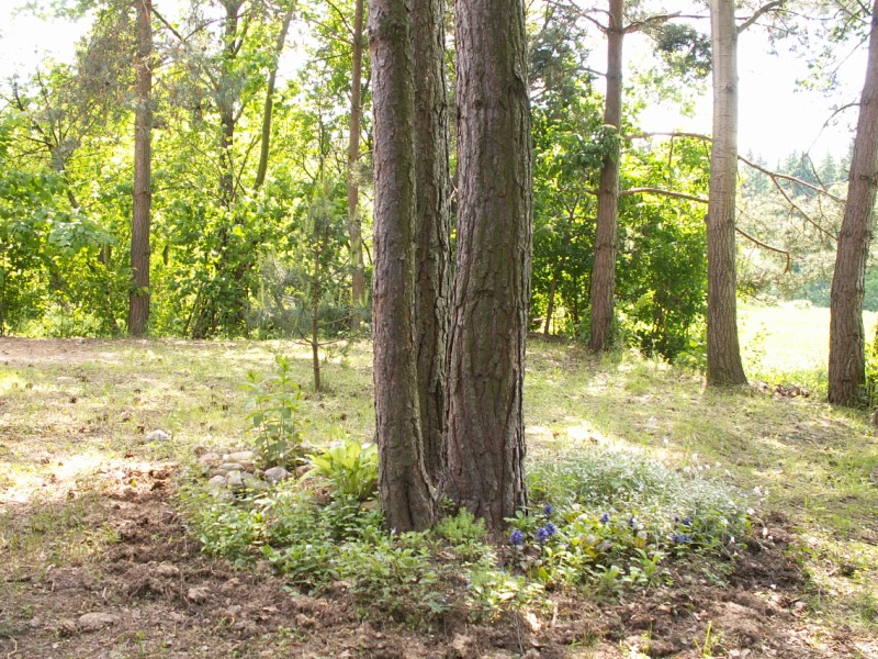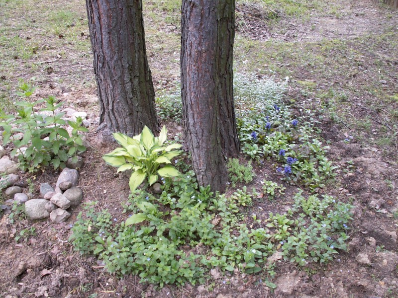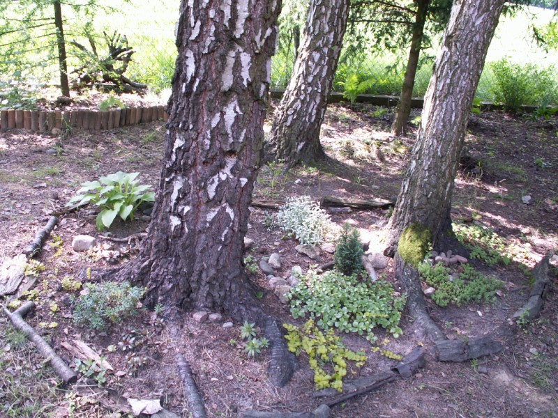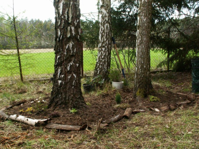 I wtedy postanowiłam, że utworzę rabatkę dla skalniaków w obrębie trzech blisko siebie rosnących brzóz. Na kolanach, po kawałku wydzierałam kłącza perzu, a musiałam to robić dokładnie, gdyż do tej pory nie odrosły i mój niby-skalniaczek jest „czysty” a roślinki ładnie się rozrosły!