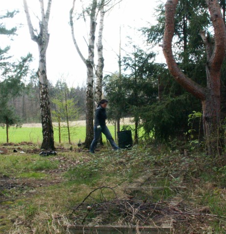 Postanowiliśmy razem z MMŻ*, że nie będziemy jeszcze siać trawy w tej części ogrodu przed domem ze względu na plany budowy tarasu, na co będzie potrzeba trochę terenu choćby na wysypanie piachu, czy składowanie materiałów. Przeniosłam się więc do tej bardziej dzikiej części ogrodu, aby ją troszkę poskromić 🙂 Znów grabiłam, zbierałam szyszki, resztki spróchniałych gałęzi, kolejny raz pryskałam herbicydem, wypatrując przy tym każdy nieśmiało zieleniący się odrost jeżyn.