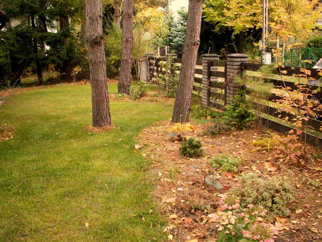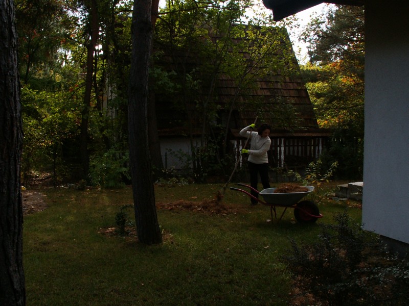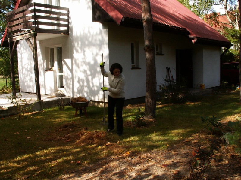 Zaczęłam od wygrabienia sporej ilości liści i igieł i szyszek. Pomyślałam, że czeka mnie taka praca kilka razy w roku, zwłaszcza wiosną i jesienią i zaczęłam się zastanawiać co robić z taką ilością „materiału”? Góry kompostowe rosną, zresztą zdążyłam już się naczytać na forum o tym jak zakładać kompostownik i mimo, że jeszcze ekspertem nie jestem, to wiem, że z samych liści, szyszek i igieł dobrego materiału nie będzie. Będę musiała o tym pomyśleć.